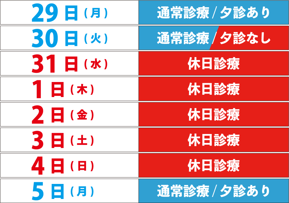 2025年〜2026年の年末年始の診療体制は次の通りです。