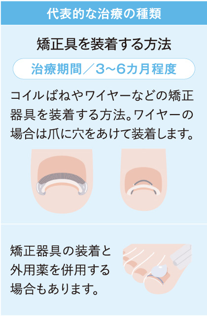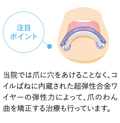 当院では、超弾性合金ワイヤーの弾性力によって、爪に穴をあけることなく爪の湾曲を矯正する治療や、ワイヤーなどの矯正器具を装着する方法など、患者さんの状態とニーズに合った治療を行っています。